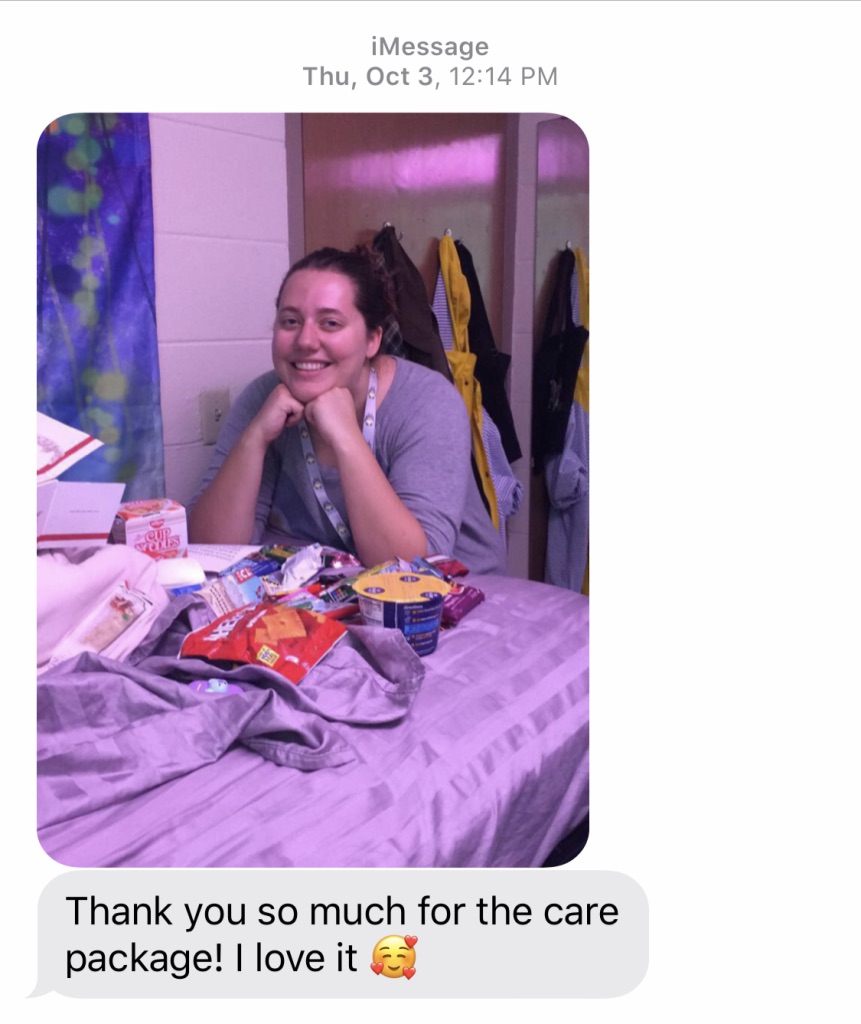 Immanuel’s youth program sent 25 care packages to Immanuelites in college this fall. Care packages included homemade desserts, snacks, and quick meals to help our college students during their end of semester exams and papers. “We want our college students to know that God loves them and we do, too–even if they’re many, many miles away,” Liz Pruchnicki, Immanuel’s Youth Director remarked about the program. Check out the great “thank you” selfies we got in response below!